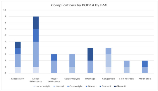 In total, 20 patients (29%) experienced 32 postoperative complications by two weeks (Table 3 and Figure 2). Furthermore, 75% of all 32 complications were in overweight or obese patients. There was a significant difference between POD-14 complication rates across the underweight, normal-weight, and elevated BMI groups (p = 0.002). There was no difference in the complication rates between patients with and without diabetes mellitus (p = 0.58). A total of 66 patients reported data regarding osteomyelitis status. Complication rates were not significantly different across acute, chronic, and negative osteomyelitis statuses.