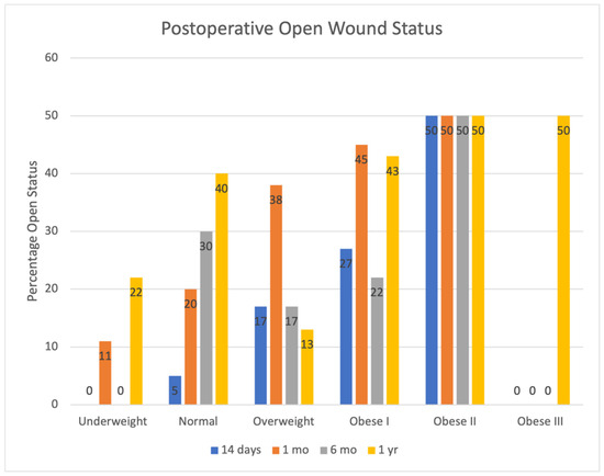 Fifty-nine patients had closed wounds and nine had open wounds at POD-14 (Table 4 and Figure 3). There was no significant correlation between a patient’s BMI or osteomyelitis status and wound status. Comorbid diabetes mellitus also had no impact on the wound closure rates at any time point. The most common cultures identified in wounds were P. aeruginosa, S. aureus, and E. coli (Table 5). Negative cultures were found in 22% of closed wounds and 13% of open wounds. The cultures did not vary significantly between open and closed wounds (p = 0.68). There was a significant difference in the bacterial culture incidence between patients with complications vs. without complications (p < 0.001).