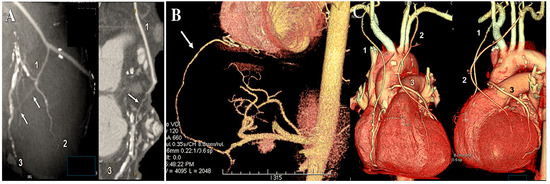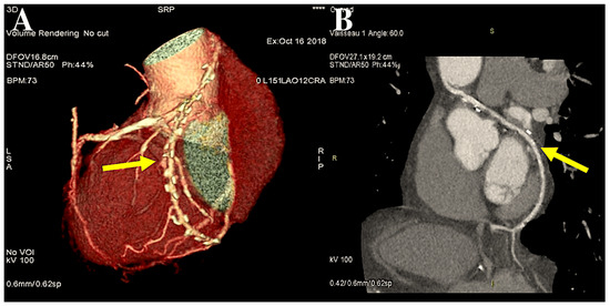 The figure illustrates the post-processing of CT angiography of CABG using volume rendering (A) and two-dimensional curved imaging with automatic tracking. (B): CT angiographic control of the radial artery at 27 years. The radial artery (yellow arrow) was utilised as the second target conduit on the second obtuse branch of the left coronary circumflex artery and the posterior descending artery. Abbreviations: CABG, coronary artery bypass grafting; CT, computed tomography.