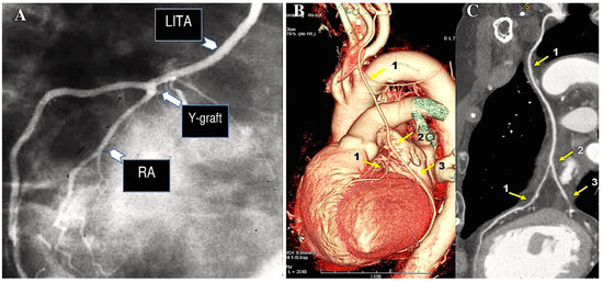 The illustration depicts a CABG procedure utilising bilateral internal thoracic arteries anastomosed with Y-graft technique (A–C). (A): Conventional angiogram demonstrates the patency of the RA. The radial artery is employed as a Y-graft technique (LITA-RA-Y) for sequential anastomoses. (B,C): The Y-graft technique (LITA-RITA-Y) is utilised on the left anterior descending artery (LAD) and on the second marginal branch. 1. LITA-LAD; 2. LITA-RITA-Y; 3. RITA-second marginal branch. Abbreviations: LAD, left anterior descending; LITA, left internal thoracic artery; RA, radial artery; RITA, right internal thoracic artery.