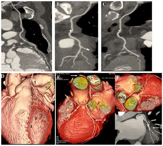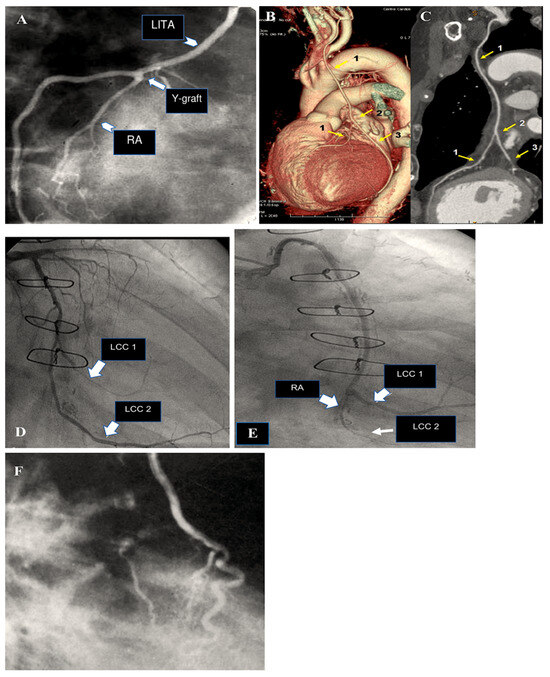 This shows how the radial artery can be used for CABG, either in a Y-shape for sequential grafting or for isolated grafting (A–F). (A): The RA is still open after five years. RA is used as a Y-graft technique for sequential anastomoses. (B,C): Y-graft technique on LAD and LCC2 at 6 years. (D,E): The blood flow is competitive, which causes the distal segment of the RA to shrink. The RA graft was anastomosed to the first and second obtuse branch of LCC at 8 years. (D): The circumflex coronary artery is free from significant narrowing, allowing unrestricted flow to the second obtuse branch. The first obtuse marginal is hardly visible. (E): The RA supplies the first obtuse branch (LCC1) with a string-like involution of its distal segment and no opacification of the second obtuse branch. (F): RA grafted on LAD and controlled at 18 years. Yellow arrow: 1. LITA; 2. Y-graft; 3. RA (LCC2). Abbreviations: CABG, coronary artery bypass grafting; LAD, left anterior descending; LCC, left coronary circumflex; LCC1, first obtuse branch; LCC2, second obtuse branch; RA, radial artery; RCA, right coronary artery.