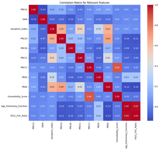 For this study, we utilized a public dataset available on Kaggle [2], which contains 17 characteristics in total. Of these, 16 are independent variables that represent a combination of clinical, demographic, and procedural factors. The dependent variable indicates whether the patient survived beyond one year after undergoing major lung resection surgery for primary lung cancer. This binary classification problem forms the core of the analysis, distinguishing between survival within one year (class 1) and survival beyond one year (class 2). In a correlation matrix, values range from 1 to 1, where 1 indicates a perfect positive linear relationship, meaning both variables increase together in exact proportion. A value of 0 means there is no linear relationship between the variables, though they may still have a non-linear connection. A value of −1 represents a perfect negative linear relationship, where one variable increases as the other decreases in perfect inverse proportion. Values between 0 and 1 indicate varying degrees of positive correlation, where one variable tends to increase as the other increases, while values between 0 and −1 represent varying degrees of negative correlation, where one variable tends to increase while the other decreases. The closer the value is to 1 or −1, the stronger the linear relationship, and values near 0 suggest a weaker or no linear relationship. In Figure 1, the correlation matrix is presented exclusively for the relevant features extracted from the dataset.