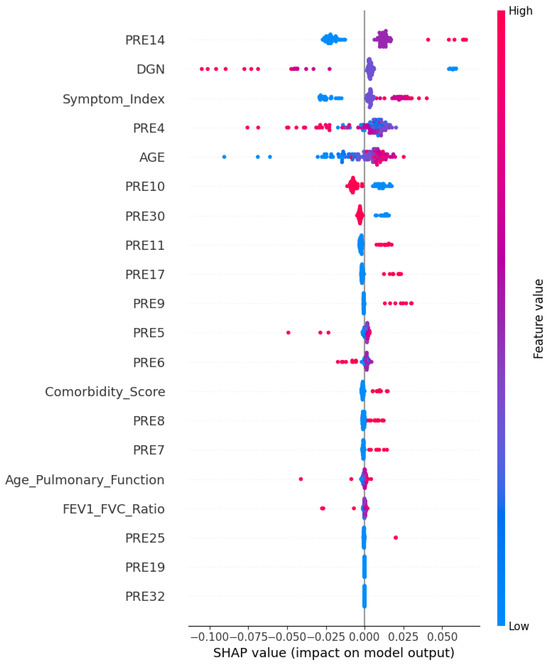 After applying the SHAP explainability method to the dataset, we identified the most relevant features to predict postoperative survival outcomes. These features, presented in the figure below, highlight the variables with the highest impact on the XplainLungSHAP model’s decision making process. The identified features include the following: PRE14, DGN, Symptom_Index, PRE10, PRE30, PRE11, PRE17, PRE9, PRE6, Comorbidity_Score, Age_Pulmonary_Function, and FEV1_FVC_Ratio (see Figure 2).
