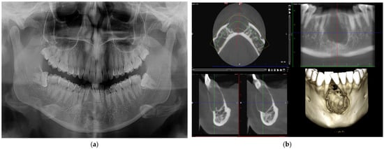 (a) Preoperative panoramic radiograph; (b) CBCT scan.
