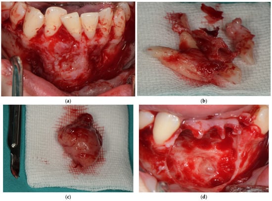 (a) Raised mucoperiostal flap showing inflated bone; (b) extraction of the affected teeth; (c) gross examination of the OM; (d) bone after completion of enucleation and curretage.