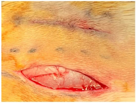 The anesthetic depth was rechecked and adjusted as needed by the veterinary staff. To reduce bleeding, the subcutaneous tissue beneath the panniculus carnosus aponeurosis (PCA) was infiltrated with 0.5% lidocaine with epinephrine in water (1:200,000) 15 min before the incisions were made. Two incisions (each 4 cm long) were made through the skin and underlying panniculus carnosus aponeurosis, with one skin incision to the left and one to the right of the midline (Figure 1). To ensure each incision was as uniform as possible and of the same depth, an initial, very small incision was made, and a sterile scalpel guide was gently inserted in the loose areolar plane beneath the panniculus carnosis aponeurosis, precisely beneath the incision skin markings, to ensure that the incisions were made in one fluid motion without injuring skeletal muscle or its fascia. No additional dissection occurred. Any bleeding was managed with epinephrine-soaked Telfa® pads. Electrocautery was not needed or used.