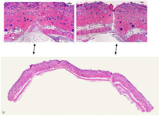 Wound H&E histology: morphological changes, closure, and re-epithelialization 3 days post-injury: Left: incision by EB; right: incision by SB; bottom: full representative sample with incision by EB (left) and SB (right).