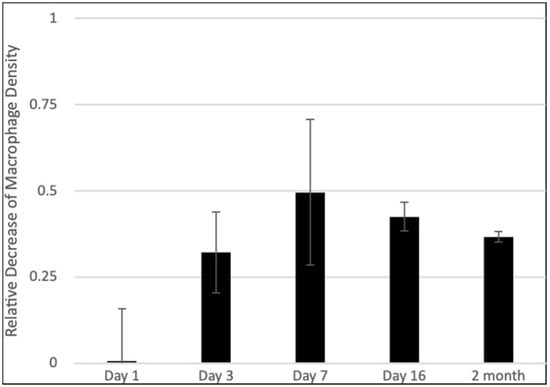The relative difference between the macrophage density in skin incisions made with the experimental blade MEB vs. the macrophage density corresponding to incisions made with the standard blade MSB is displayed in Figure 5. Data analysis shows that the macrophage infiltration exhibited a noteworthy decrease (M in skin incisions made with the EB compared to that corresponding to skin incisions made with the SB for all time points. These results suggest that the inflammatory response in nanometric-scale-polished blade skin incisions is reduced at all time points post-operation.