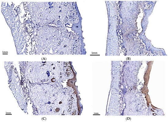 Cytokine immunohistochemistry: representative images showing the expression of TGF-β (A,B) and IL-1 (C,D) in scars made by SB (A,C) and EB (B,D) 7 days post-surgery.