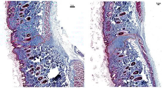 After euthanasia, incisions were harvested along with the surrounding area of normal tissue. The tissue was then cut into transverse 5 mm wide strips (3 per animal) located midway between the sutures. Each biopsy contained both incisions. Then, the strips were fixed in 10% formalin and processed for paraffin embedding.