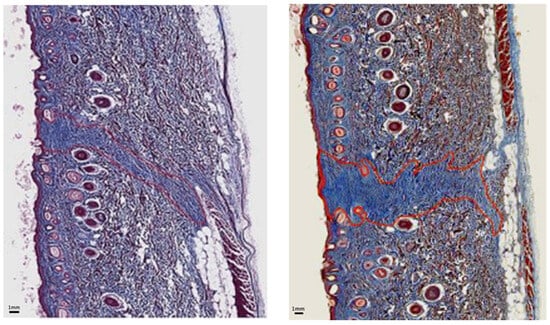 Scar histology 16 days post-surgery: Histological sample stained with trichrome at 16 days post-surgery showing less scarring in region of EB skin incision (left) than SB skin incision (right).