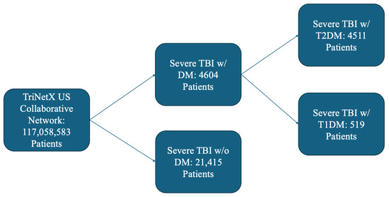 Patients of all ages diagnosed with severe TBI were included in this retrospective cohort analysis (Figure 1). We used codes from the International Classification of Diseases, Tenth Revision, Clinical Modification (ICD-10-CM), and Logical Observation Identifiers Names and Codes (LOINC) codes to identify patients with their first incidence of TBI. A severe TBI diagnosis was made with at least one of the following ICD-10-CM codes: Intracranial injury (S06), Fracture of skull and facial bones (S02), or Other and unspecified injuries of head (S09), along with either a Glasgow coma scale score of 3–8 (LOINC 9269-2), Glasgow coma scale score of 3–8 (ICD-10-CM R40.243), Glasgow coma scale score of 3–8, unspecified time (ICD-10-CM R40.2430), Glasgow coma scale score of 3–8, at hospital admission (ICD-10-CM R40.2433), Glasgow coma scale score of 3–8, at arrival to emergency department (ICD-10-CM R40.2432), Glasgow coma scale score of 3–8, in the field [EMT or ambulance] (ICD-10-CM R40.2431), or a Glasgow coma scale score of 3–9, 24 h or more after hospital admission (ICD-10-CM R40.2434) within 1 month on or after any instance of the TBI. Case cohorts were diagnosed with DM (ICD-10-CM E08-E13). Control cohorts were individuals who suffered a severe TBI but were not previously diagnosed with DM. For sub-group analysis, individuals with insulin-dependent DM were identified from the cohort of DM patients using the following ICD-10-CM code: E10. Likewise, individuals with insulin-independent DM were identified from the cohort of DM patients using the following ICD-10-CM code: E11.
