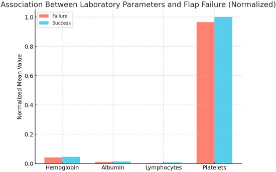 The analysis of the baseline characteristics revealed significant differences between patients with and without flap failure. In particular, patients who experienced failure had significantly lower preoperative levels of hemoglobin (p < 0.01) and albumin (p < 0.02), as well as a lower lymphocyte count (p = 0.003). Interestingly, we did not observe significant differences in platelet count between the two groups (p = 0.218).