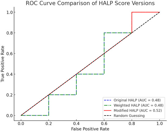 - “Modified” HALP score (second and final modification of HALP score): in the final iteration, we refined the coefficients: Modified HALP = (−0.3298 × Albumin × Lymphocytes) + (0.4172 × Platelets) + (−0.8092 × Hemoglobin) + (−0.0031).