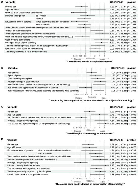 Forest plot of the four final logistic regressions for (A) general interest in surgery, (B) intentions to pursue further practical education in traumatology, (C) aspirations to become a trauma surgeon, and (D) the positive impact of the course on subsequent specialization choice. The graphs were plotted using the odds ratios (ORs) computed from the regression coefficients, and the bars visualize the corresponding 95% confidence intervals (CIs), indicating the strength and direction of the association between the statements on the left and the corresponding target parameters on the bottom. An OR > 1 suggests an increased likelihood of agreement with the target parameter, whereas an OR < 1 indicates a decreased likelihood.