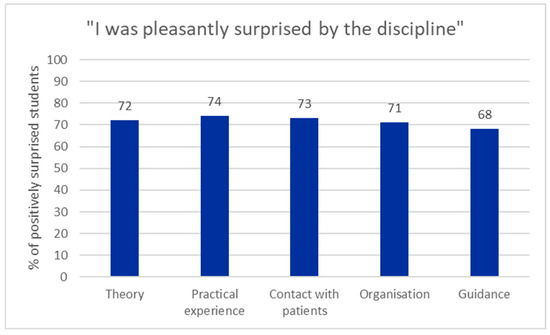 Students who found their course expectations were exceeded demonstrated the most pronounced approval ratings in terms of practical experience and direct patient interaction (Figure 3). An additional insight arose from the logistic regression analysis. Participants who possessed a definite intention to pursue a career as a surgeon perceived the course as somewhat less challenging. Conversely, students disinterested in the surgical field generally considered the course demands to be well-matched to their skill level. Furthermore, the appropriateness of the perceived difficulty had effects on the outcome; students who found the course appropriate felt positively influenced in their interest specifically in orthopedics and trauma surgery.