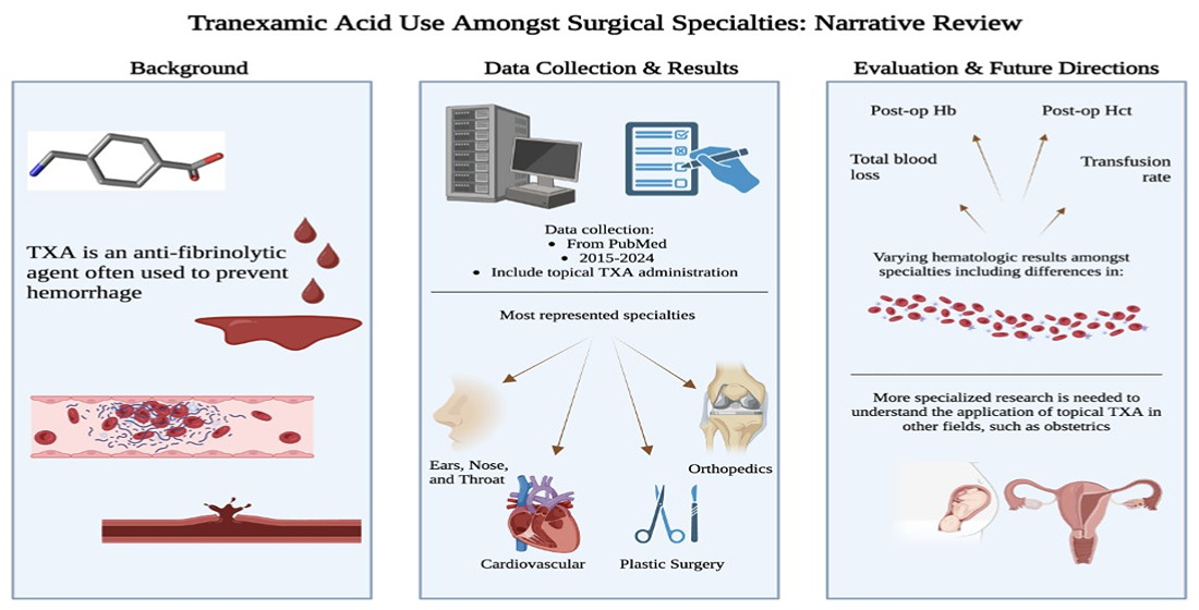 Chicago/Turabian StyleAmarasinghe, Randilu, Mohammad Sunoqrot, Samita Islam, Medha Gaddam, Mona Keivan, Jaclyn Phillips, and Homa K. Ahmadzia. 2025. "Topical Tranexamic Acid Use Amongst Surgical Specialties: A Narrative Review" Surgeries 6, no. 3: 69. https://doi.org/10.3390/surgeries6030069