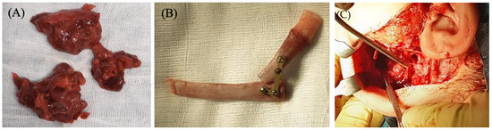 (A) Left mandibular neoplasm excised. (B) Costochondral graft shaped to reconstruct the defect resulting from the left hemimandibulectomy. (C) Facelift approach and extended surgical exposure of the interested hemimandibular region.