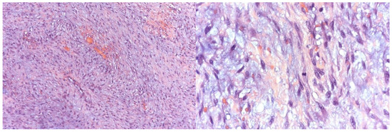 Histopathological examination confirmed a benign mesenchymal tumor composed of monomorphic spindle cells arranged in short, interwoven bundles within a diffusely myxoid stroma (Figure 3). The mitotic index was low (1 mitosis per 10 HPF), with a Ki67/MIB1 proliferation rate of 7%. Immunohistochemistry revealed weak diffuse positivity for CD99, while all other markers tested (p63, CD34, CD68/PGM1, S-100, EMA, MUC-4) were negative. No necrosis was present, and fragments of bone tissue were observed interspersed with tumor cells.