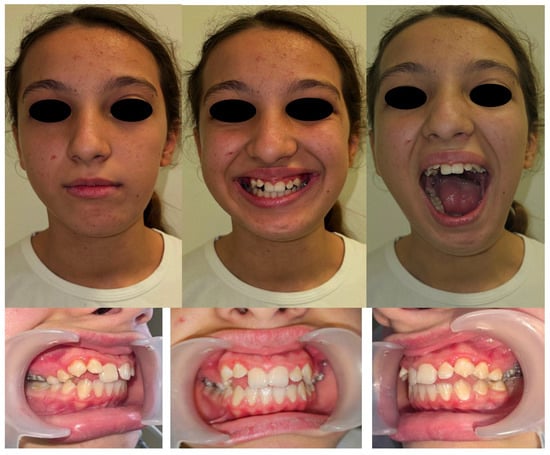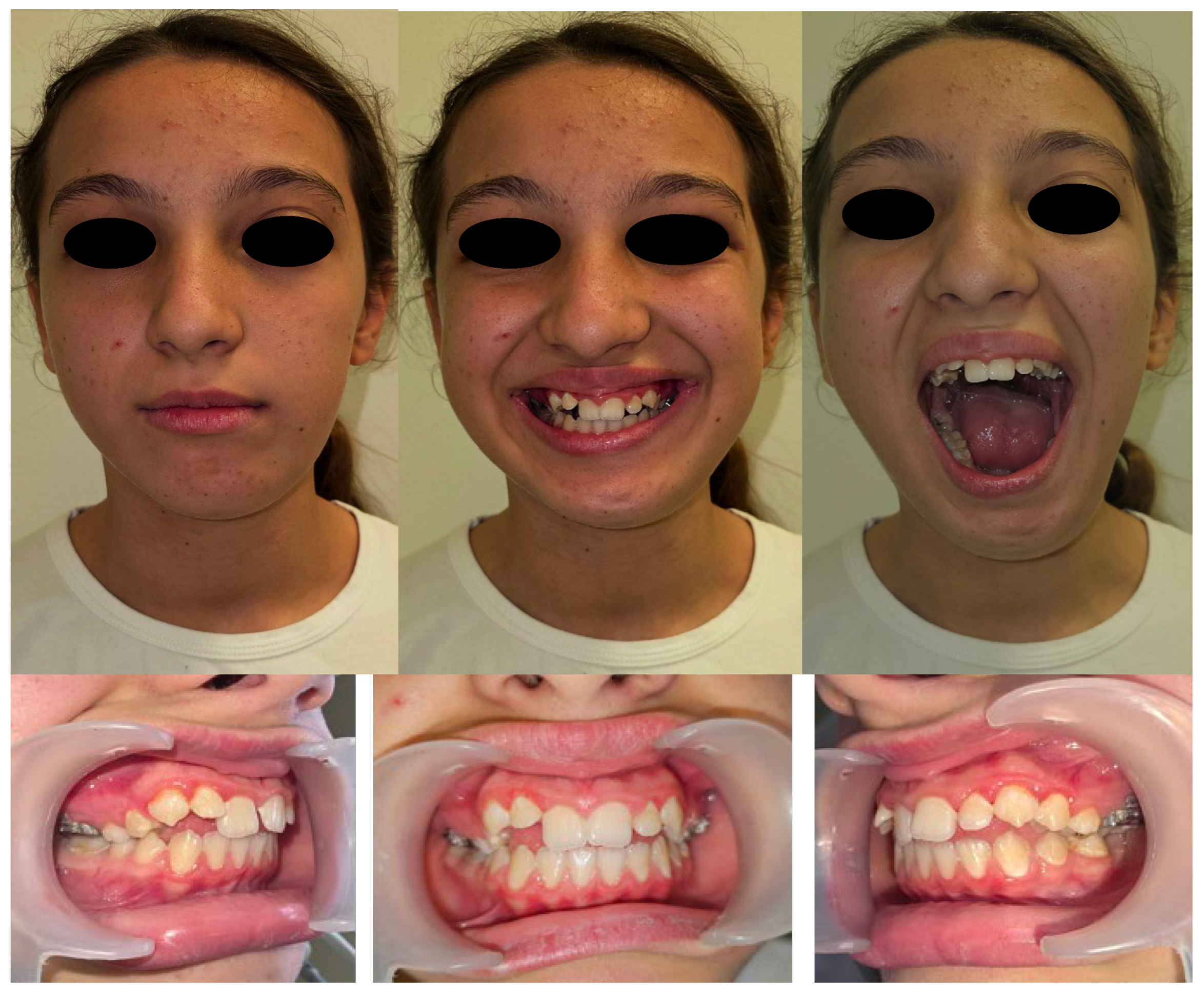 At four years postoperatively, development of the maxillomandibular complex was deemed satisfactory, with preserved growth symmetry on the left hemiface aside from a mild volume deficiency attributable to the intrinsic difference between the graft and native mandibular tissue (Figure 5). A slight limitation in right lateral mandibular deviation was observed but deemed clinically acceptable. Maximal mouth opening was within normal limits, and the patient reported no difficulties with mastication or speech. The reconstructed mandibular segment provided adequate contour and functional stability, although its volume was not sufficient to support prosthetic rehabilitation at this stage. These findings were assessed through serial morpho-functional clinical evaluations and imaging studies, including CT scans performed at 6 months, 2 years, and 4 years after surgery. Orthodontic therapy continues to support proper dental eruption and occlusion. The need for secondary bone grafting for pre-prosthetic purposes, followed by implant-prosthetic rehabilitation, will be reassessed upon completion of skeletal growth.