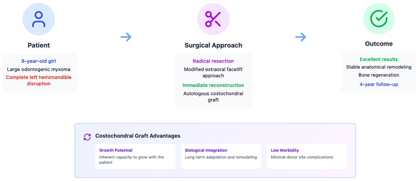 Background: Odontogenic myxoma (OM) is a rare, benign, but locally aggressive tumor of odontogenic mesenchymal origin. This study aims to expand current knowledge by integrating a concise literature review with a detailed case report of a surgically complex pediatric OM, treated using a biologically advantageous reconstructive technique. Methods: In this study, we report the case of an eight-year-old girl presenting with a large OM that caused complete disruption of the architecture of the left hemimandible. Due to the tumor’s size and bone involvement, radical resection was necessary. A modified extraoral facelift approach was employed to ensure adequate surgical access while avoiding intraoral incisions and minimizing visible scarring. Immediate mandibular reconstruction was performed using an autologous costochondral graft. Discussion: Although infrequently used in modern surgical practice, the costochondral graft offers unique advantages in pediatric patients due to its inherent growth potential and capacity for long-term biological integration. In this case, the graft allowed restoration of mandibular continuity and form with minimal donor site morbidity, demonstrating its viability even today. Conclusions: This case underlines the importance of tailored reconstructive strategies in pediatric OM. The costochondral graft provided excellent functional and esthetic results, with four-year follow-up confirming stable anatomical remodeling and bone regeneration.