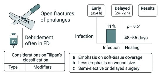 One of the most relevant observations emerging from this work is that, unlike what is consistently emphasized for fractures of the lower extremities, timing alone does not appear to be the primary determinant of infection or functional outcome in open hand fractures. Although we did not compare upper and lower limbs, the prior hand-specific literature notes practical differences from long-bone injuries (e.g., anesthesia, soft-tissue handling, and service setting). Our data are limited to open phalangeal fractures and do not address inter-limb differences. This finding aligns with the systematic review by Ketonis et al. [