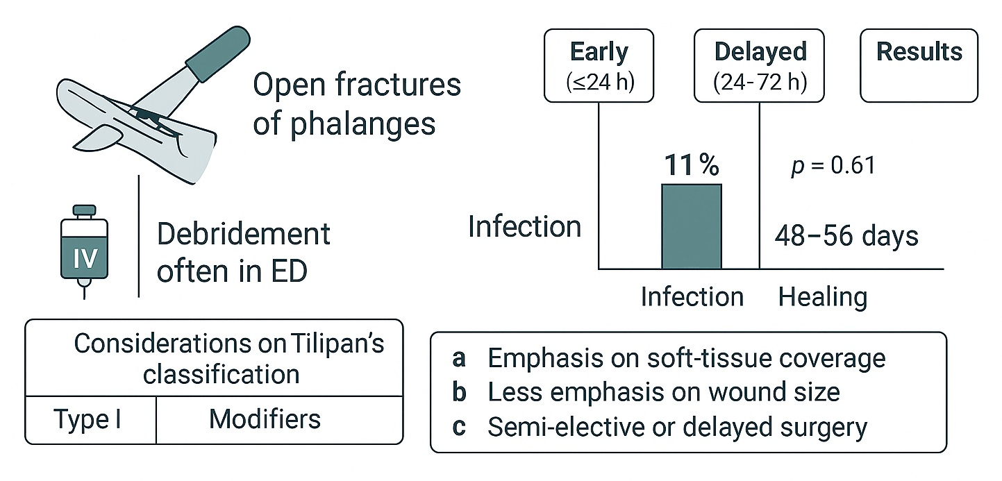 Because current protocols still extrapolate from long-bone data, a hand-specific pathway is warranted—one that foregrounds immediate IV antibiotics, allows a flexible but prompt surgical window after adequate bedside debridement, and recognizes the lower baseline infection risk when counselling patients and allocating resources [