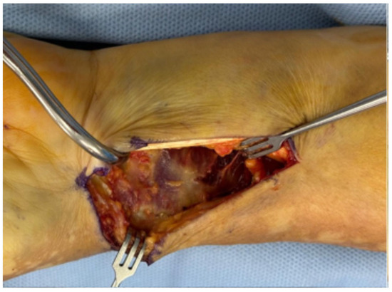 The superficial layer of the FCR sheath is longitudinally incised, and the FCR tendon is retracted ulnarly to protect the median nerve (Figure 2). The antebrachial fascia and the deep layer of the sheath are then exposed and opened (Figure 3). Adequate proximal exposure of the sheath is essential, and the distal floor should be opened carefully to avoid neurovascular injury.