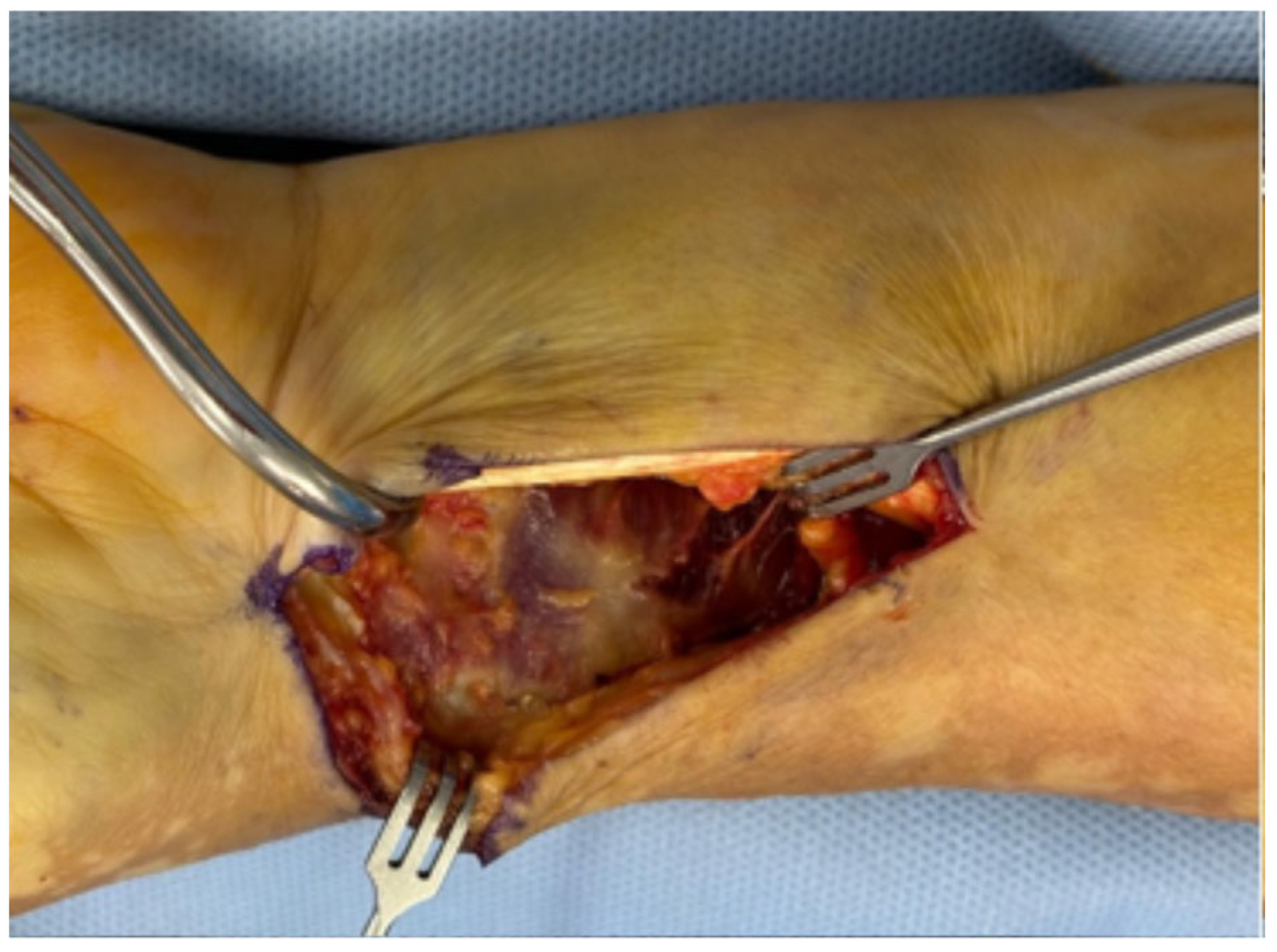 Figure 2). The antebrachial fascia and the deep layer of the sheath are then exposed and opened (