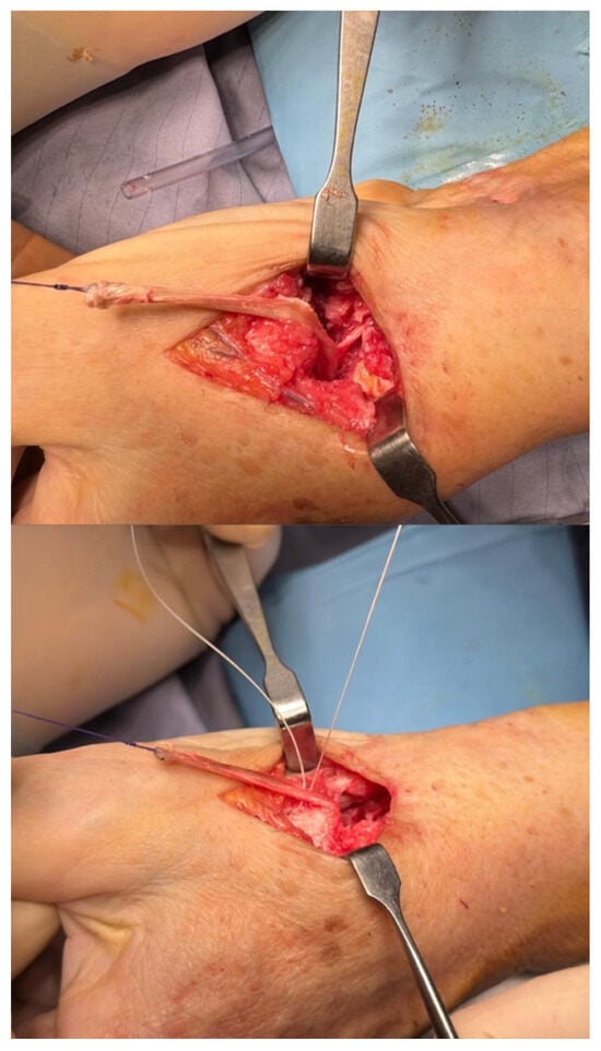 Using the same positioning and locoregional anesthesia, a lateral approach was used for the left hand. The trapezium was excised completely, and a tendon interposition arthroplasty was performed using a slip of the flexor carpi radialis tendon fixed with an anchor on the base of the first metacarpal bone (Figure 3). The joint capsule and soft tissues were sutured to ensure stability and mobility. The wound was closed in layers and dressed, and a cast was applied, with the wrist and thumb included.