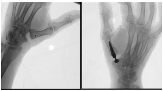 - Herren, D.B.; Marks, M.; Neumeister, S.; Schindele, S. Short-term recovery after implant versus resection arthroplasty in trapeziometacarpal joint osteoarthritis. J. Hand Surg. Eur. Vol. 2023, 48, 1048–1055. [Google Scholar] [CrossRef] [PubMed]