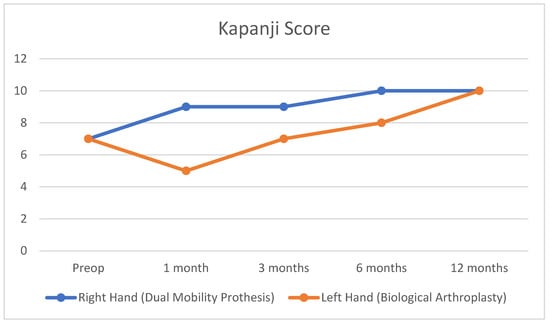 Range of motion (ROM) recovery was assessed using the Kapandji score for thumb opposition and by directly comparing thumb abduction and extension between the two hands. The hand treated with a trapeziometacarpal prosthesis showed higher Kapandji scores during the early postoperative period; however, the hand treated with trapeziectomy and suspension arthroplasty achieved comparable opposition by 9–12 months. In contrast, differences in thumb abduction and extension consistently favored the hand treated with the trapeziometacarpal prosthesis throughout follow-up. Statistical analysis performed across all data up to 12 months confirmed that these differences were significant for both abduction and extension, while no significant difference was observed for the Kapandji score (Table 3) (Figure 8).