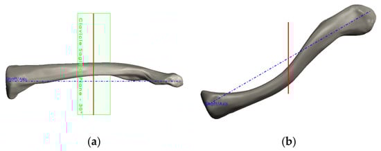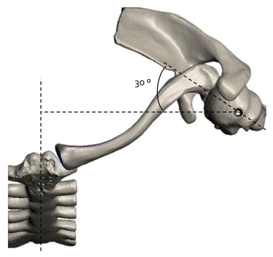 Regarding its superior view of its anatomical positioning, the Clavicle is rotated 30° about the longitudinal axis [22], as shown in Figure 13.