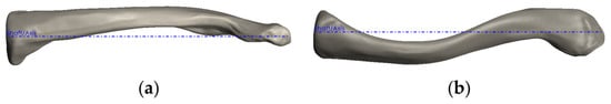 Considering another position, such as the anatomical one, in which the Humerus is not vertically aligned, can be a variable that is difficult to parameterize, as it depends on several factors, such as anatomical ones, namely its physical complexion (fat mass, muscle mass, anthropometric measurements, etc.) and the way in which the imaging data obtained by computed tomography were acquired, as different acquisition positions give rise to different anatomical representations [20]. Therefore, when considering the alignment of the aforementioned axes (anatomical axis of the Humerus and anatomical longitudinal axis), the starting point for any study is always the same.