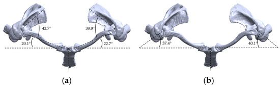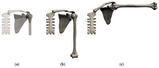 As an example, the model in Figure 47 shows the Humerus in 90° abduction with the corresponding change in position of the Clavicle and Scapula, which, due to the synergistic movement characteristic of this joint, also rise by 30° and 30°, respectively, in relation to the antero-posterior axis [17,20,34,35,39,40,41,42,43,44].