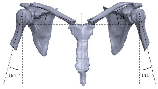 Regarding the lateral view of its anatomical positioning, the Scapula is rotated 60° about its longitudinal axis [22], as shown in Figure 16.