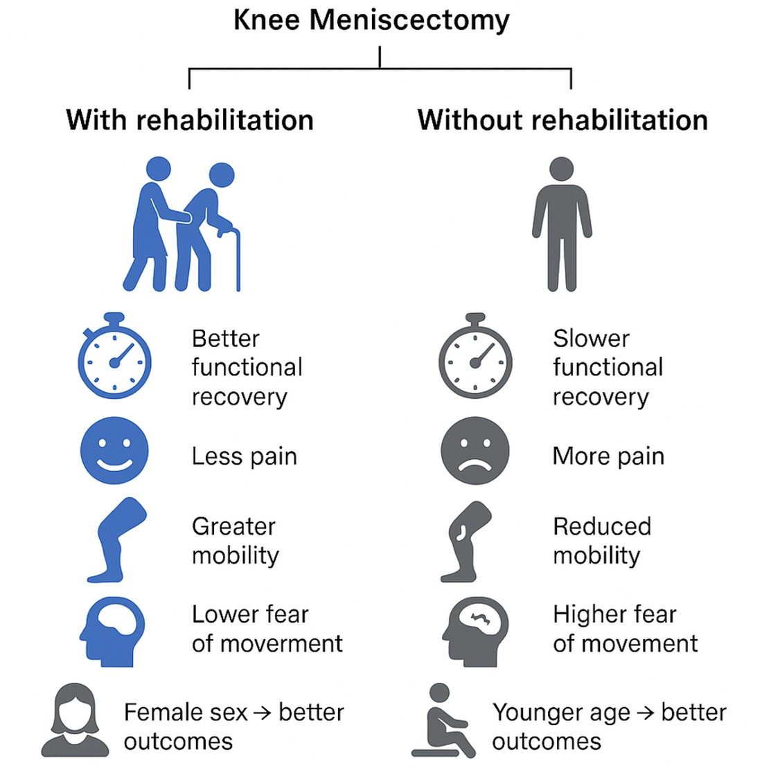 Overall, recovery after meniscectomy appears to be shaped by a combination of demographic, clinical, and lifestyle factors rather than by postoperative rehabilitation alone. While rehabilitation may not consistently enhance objective functional performance, it confers meaningful clinical benefits that support its role in comprehensive care.