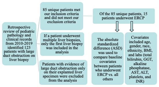 We performed a retrospective evaluation of pediatric patients with large duct obstruction on liver biopsy from 2010 to 2019 at our center, a major referral and transplant center in the Western United States. The study was approved by the Stanford IRB (Protocol # 45179, 52588). Inclusion criteria were all patients 18 years of age and under who underwent liver biopsy with pathology diagnosis of large duct obstruction from that liver biopsy and who had undergone pre-biopsy imaging, which did not reveal evidence of biliary obstruction. Patients whose liver biopsy was performed at the time of native liver explant were excluded from the analysis. For patients who had more than one liver biopsy, only the first liver biopsy demonstrating large duct obstruction was included in the analysis. Histologic diagnoses were rendered by subspecialized hepatobiliary pathologists using hematoxylin and eosin, trichrome, rhodanine, and diastase-predigested periodic acid–Schiff stains to assess for standard morphologic features of large duct obstruction, including portal edema, ductular proliferation, neutrophilic peri-cholangitis, canalicular/ductal cholestasis, reactive epithelial changes of the interlobular bile ducts, and acute cholangitis. Features of prolonged obstruction, such as fibrosis, feathery degeneration, and periportal copper accumulation, were also examined. Each patient record was thoroughly reviewed by two reviewers, and the following covariates were collected for each patient: age, gender (female/male), race (white, Asian, etc.), ethnicity (Hispanic/non-Hispanic), insurance status (private insurance, government insurance, unknown), body mass index (BMI), andlabs (total bilirubin, Gamma-glutamyl transferase (GGT), alkaline phosphatase (ALP), aspartate aminotransferase (AST), alanine aminotransferase (ALT), platelets, and international normalized ratio (INR)). Hospital length of stay was analyzed in both groups, as was hospital re-admission in the 6 months following liver biopsy demonstrating large duct obstruction. ERCPs were categorized as positive or negative, depending on whether there was an intervenable finding at the time of ERCP. ERCPs with intervenable findings were categorized as ‘positive’, and findings classified as ‘intervenable’ included biliary stricture or intrinsic/extrinsic obstructing lesion, biliary stone, papillary stenosis or ampullary obstruction, and anatomical irregularity of the bile duct for which stent placement was necessary. See Figure 1 for conceptual depiction of study flow.
