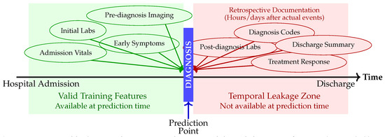 The primary objective of this study is not to develop the most accurate or generalizable predictive model, but rather to illustrate the essential role of clinical expertise in preventing data leakage and ensuring methodological transparency in ML research. Many published studies in this field (often conducted and reported by computational or engineering teams without direct clinical involvement) report high performance metrics without acknowledging the risk of leakage from deterministically linked or temporally implausible features. Inadvertently, such studies may include post-diagnostic or future information as model inputs, rather than restricting features to those available prior to diagnosis or clinical decision-making. This practice can result in artificially inflated validation metrics that do not translate to reliable performance in real-world deployment. The concept of temporal data leakage and its impact on model validity is illustrated in Figure 1.