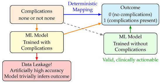 Inclusion of ‘Complications’ as a feature in ML model training introduces data leakage, as the model can directly infer the outcome from this column. This results in artificially high performance metrics that do not reflect the model’s ability to generalize to real-world clinical scenarios, where the presence or absence of complications is not known at the time of prediction. Consequently, models trained with access to ‘Complications’ are not clinically actionable (see Figure 2).