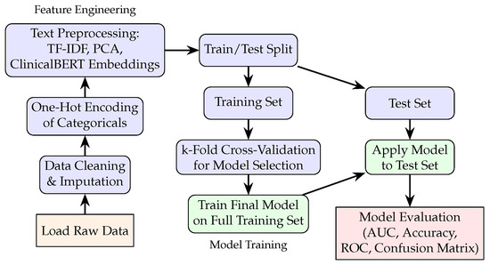 Figure 3 illustrates the end-to-end experimental workflow adopted in this study. The process begins with loading the raw anesthesia dataset, followed by data cleaning and imputation to handle missing values and ensure data quality. Categorical variables are transformed using one-hot encoding, while unstructured text fields undergo preprocessing steps such as TF-IDF vectorization, dimensionality reduction via PCA, or embedding extraction using ClinicalBERT. The dataset is then split into training and test sets, with the training set further used for k-fold cross-validation to select and tune models. The final model is trained on the full training set and evaluated on the held-out test set using metrics such as AUC, accuracy, ROC curves, and confusion matrices. This modular pipeline ensures reproducibility and allows for systematic comparison of different algorithms and feature sets.