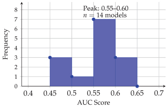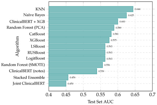 Table 3 presents a detailed comparison of fourteen distinct ML pipelines, each employing different combinations of feature engineering techniques and algorithmic approaches. The feature engineering methodologies include Term Frequency-Inverse Document Frequency (TF-IDF) vectorization with varying vocabulary sizes (100 and 500 terms), Principal Component Analysis (PCA) for dimensionality reduction, one-hot encoding for categorical variables, and Synthetic Minority Oversampling Technique (SMOTE) for addressing class imbalance. Figure 4 provides a visual representation of the AUC performance across all evaluated algorithms, clearly illustrating the modest discriminatory performance achieved despite the diversity of approaches employed.