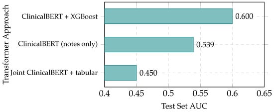 The transformer-based approaches utilizing Clinical Bidirectional Encoder Representations from Transformers (ClinicalBERT) showed mixed results. The hybrid approach combining ClinicalBERT embeddings with tabular features and XGBoost classification achieved the best performance among deep learning models with an AUC of 0.600 and accuracy of 56.7%. However, fine-tuning ClinicalBERT on clinical notes alone yielded a more modest AUC of 0.539 (52.2% accuracy), while joint fine-tuning of ClinicalBERT with tabular features resulted in the poorest performance with an AUC of 0.450 and accuracy of 44.0%.