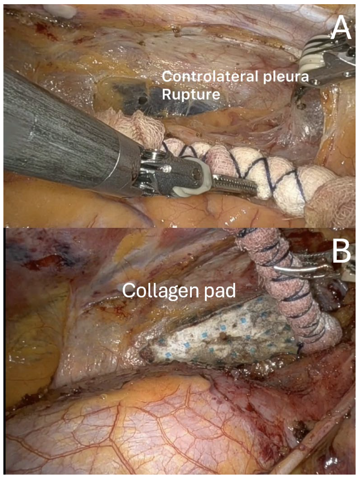 Fiorelli, A.; Leonardi, B.; Di Filippo, V.; Capasso, F.; Ciaravola, M.; Liguori, G.; Coppolino, F. Closure of a Pleural Defect Using a Collagen Pad During Robotic Thymectomy: A Preliminary Experience. Surgeries 2026, 7, 33. https://doi.org/10.3390/surgeries7010033