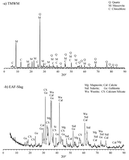 XRD patterns of TMWM and EAF-Slag phases identified are quartz (Q), muscovite (M), clinochlore (C), magnesite (Mg), calcite (Cal), siderite (Sid), gehlenite (Ge), wustite (Wu), and calcium silicate (CS).