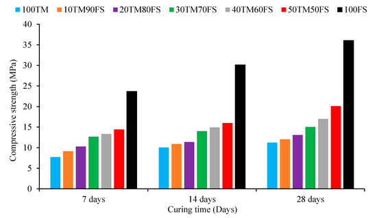 The binary-alkali-activated mixtures that contain higher dosages of EAF-Slag generated better compressive strength performance. Their chemical characteristics and, especially, their content of calcium had an influence on binder strengths in any curing period. With high hydration modulus of EAF-Slag and most specifically its role in supplying soluble Ca2+ ions, forming additional C-S-H phases. In addition the formation of N-A-S-H gel after the alkali activation of TMWM and EAF-Slag, as well as the formation of (N, C)-A-S-H gel in the binders matrix leads to an extra strengthening of the matrix structure [19]. An increment in the compressive strength resulted when the TMWM was partially replaced by EAF-Slag with different proportions in tungsten mining waste-based alkali-activated mixtures. Indeed, the compressive strength development rates are much greater in the mixtures that contain a higher dosage of EAF-Slag, particularly, in the early stage (first 7 days). It was also observed that during the curing age period (14 to 28 days), the increase in the compressive strength rate was higher in the samples that had a higher proportion of EAF-Slag. Overall, the 100TM-AAB revealed lower compressive strength development than the binary-AABs and the 100FS-AAB in all tested ages due to the low reactivity of TMWM. The results show that the most promising binary alkali-activated mixture is the sample (50FS50TM) that has a compressive strength of 20.1 MPa after 28 days curing. This mixture also has the eco-efficient advantage of containing a high percentage of EAF-Slag as an industrial by-product.
