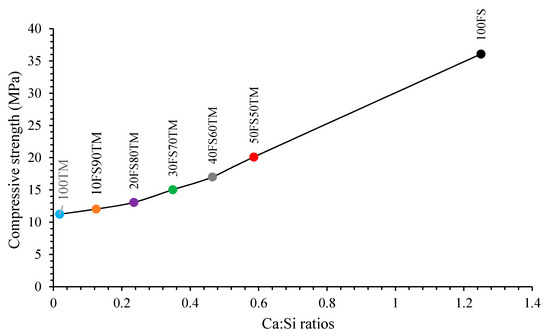 Compressive strength development of all samples after 28 days according to the initial Ca:Si ratio in the mixtures (Precursors + Activator solution).