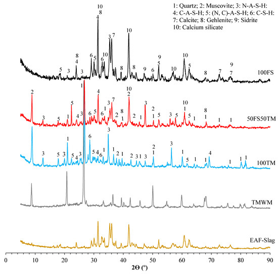 The XRD patterns of the 100TM and 100FS alkali-activated binders and the binary-alkali-activated binder (50FS50TM) samples are shown in Figure 5. The starting raw materials (TMWM and EAF-Slag) patterns were plotted for comparison purposes and their peaks were identified in Figure 2 Section 2.1. In the current study, the obtained XRD diffraction patterns data were analyzed using the Jade software. After the alkaline activation process, all the samples showed a formation of the same reaction products type presented in the semi-crystalline phases which correspond to the humps centered at approximately 30° and 50°. However, the differences were found in the quantity of the reaction products, and the dominant reaction products that formed in the different systems. In the XRD patterns of all the alkali-activated samples, most of the peaks correspond to the crystalline phases that remained unaltered after the alkaline activation of the precursors.