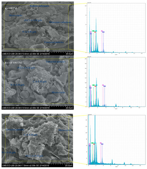 The 100TM-AAB sample (Figure 6a) had relatively poor surface conditions with a high quantity of unreacted particles (irregular shape geometry) which are embedded in the matrix and partially covered by reaction product and small needle-like phase dispersed on the surface of the matrix. The presence of the needles in the TMWM-AAB sample after the alkaline activation may correspond to the formation of carbonates (such as potassium carbonate (K2CO3) and sodium carbonate (Na2CO3)) and reaction products (sodium aluminosilicate hydrates (N-A-S-H), and (sodium, calcium) aluminosilicate hydrates (N, C)-A-S-H). The existence of a high quantity of unreacted particles was due to the low reactivity of TMWM precursor (its natural crystalline mineralogy). After the alkaline activation kinetics of TMWM, SEM-EDS analyses confirmed the formation of two types of gels i.e., N-A-S-H and (N, C)-A-S-H. The formation of sodium aluminosilicate hydrates (N-A-S-H) due to the presence of the elements in (Si, Al, Na) with high content. Moreover, the formation of hybrid gels sodium and calcium aluminosilicate hydrates (N, C)-A-S-H, corresponded to a different gel that was obtained for the mixtures with low Ca content in the precursor. The presence of the needles in the 100TM-AAB after the alkaline activation may correspond to the formation of Natrite (Na2CO3) needles due to the low reactivity of TMWM, while the Na content in the mixture remained unreactive. During the curing time the Na reacted with the CO2 in the atmosphere and formed Na2CO3 under the efflorescence phenomena. In addition, the presence of unreacted potassium (in a system with potassium as an activator) under the efflorescence phenomena may form potassium carbonate (K2CO3) [21].