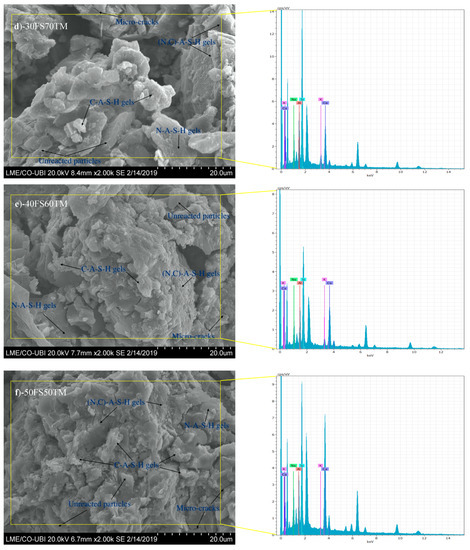 For the binary-AABs (Figure 6b–f), it is seen that the morphology of the AABs has changed and became denser upon the increase of the EAF-Slag content in the mixtures. Comparing the SEM images of the binary-AABs samples from (Figure 6b–f), it is observed that the increase of the EAF-Slag dosages in the mixtures leads to the formation of a denser microstructure due to higher reactivity of the EAF-Slag. In the binary-AABs samples, there was a formation of different reaction products (N, C)-A-S-H and C-A-S-H phases) with a globular morphology. When compared to the sample 100TM-AAB, the amount of the globular morphology of the reaction products increased with the increase of the EAF-Slag content in the mixtures. The increase of the aluminosilicate reaction products in the sample was able to cause an increase in mechanical strength. However, the N-A-S-H decreased with the increase of EAF-Slag content in the mixtures.